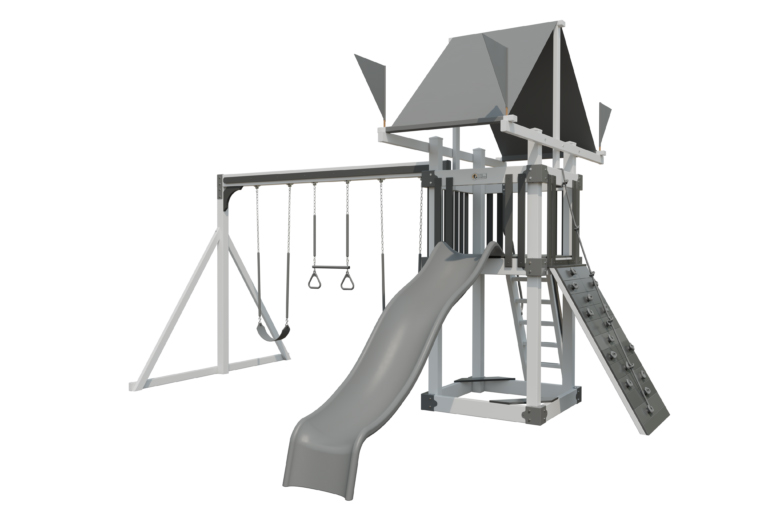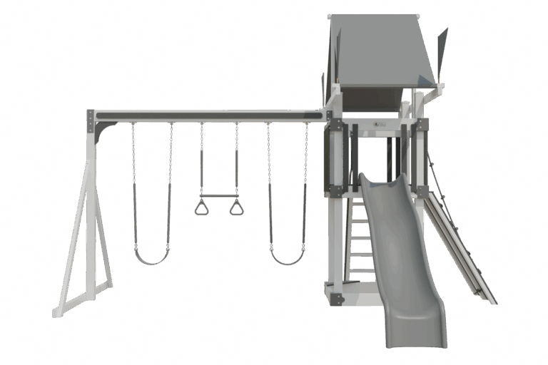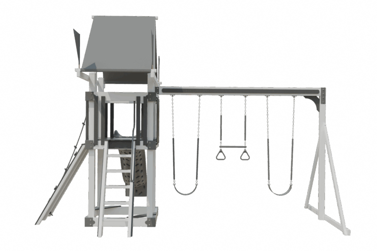 The Basecamp 44 RTGO (ready-to-go) Vinyl Playset combines Amish quality with convenient assembly. It comes in a prepackaged kit with easy-to-follow building directions and all the elements of a standard playset, including swings, a slide, trapeze rings, and a rock wall.