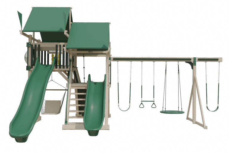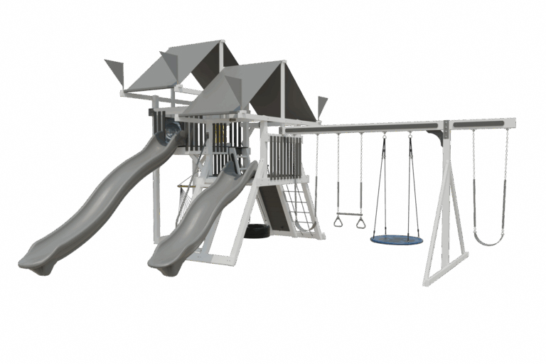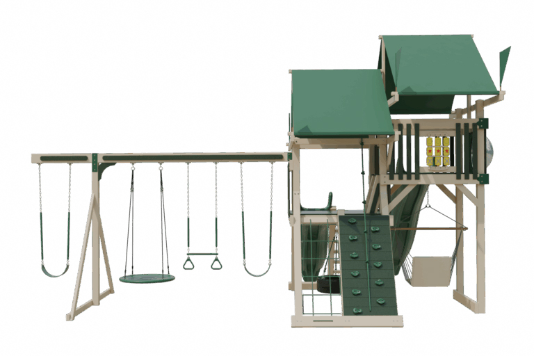 The Mega Climber includes two slides, two belt swings, a trapeze bar w/ rings, a web swing, a rope swing, a tire swing, and a web swing. Additionally, there’s a rock climbing wall and two decks with canvas coverings.