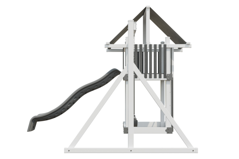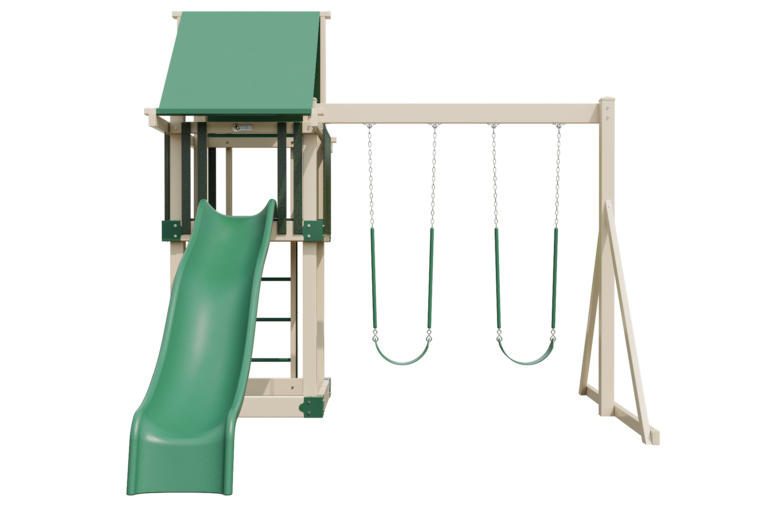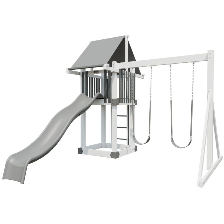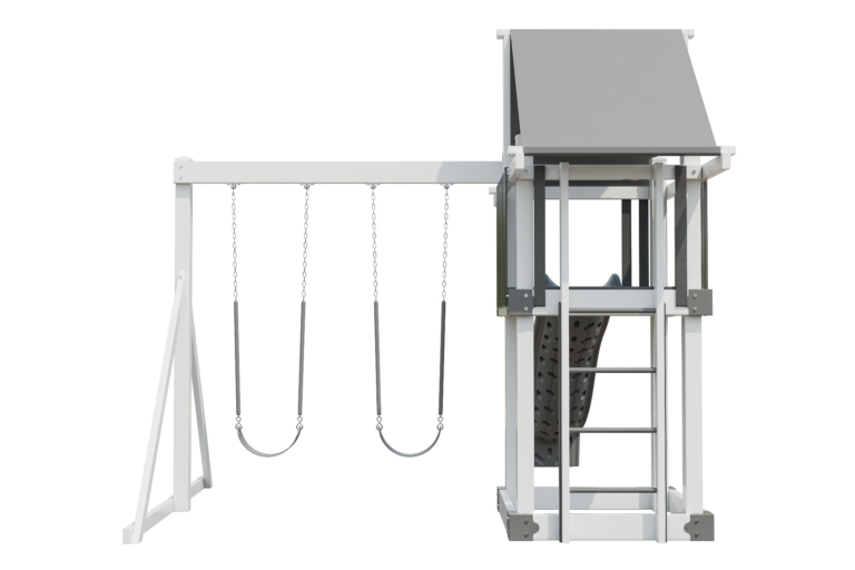 The Moderate 44 RTGO (ready-to-go) Vinyl model is a compact playset with the perfect amount of play space for two or three children. Complete with a slide, swings, and a 4×4 deck, this backyard playset proves that the best adventures can come in small packages. And you can pick the color combo you love: gray and white or green and almond.